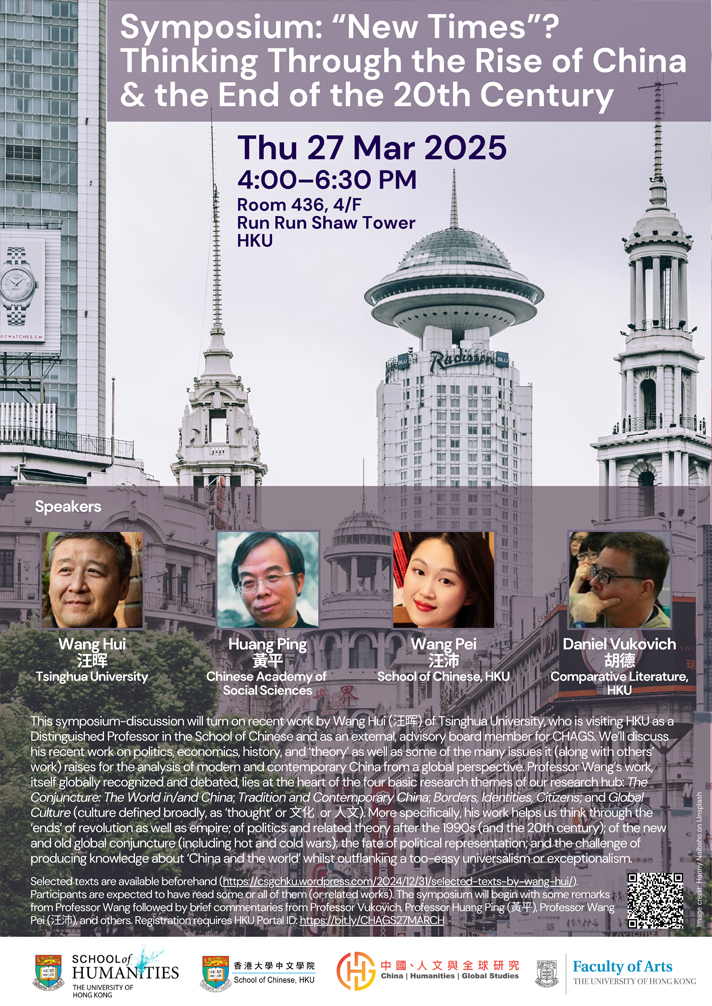 Welcome to the webpage for the research hub and virtual center, China, Humanities, and Global Studies (CHAGS). It exists to foster the inter-disciplinary, theoretically-informed study of the global conjuncture, one that so powerfully and self-evidently features the impacts and potentials of a rising China since the 1970s, as well as the “second handover” of Hong Kong as it enters a new era of integration with the mainland. It is based in the Arts Faculty, but welcomes humanities scholars working in the social sciences. By ‘global conjuncture,’ we refer to the specific ensemble of cultural, economic, and social forces that make up our given period or ‘moment’ of the global situation, as well as its political outcomes and new realities. What is China’s and Hong Kong’s place in this, and in what ways?