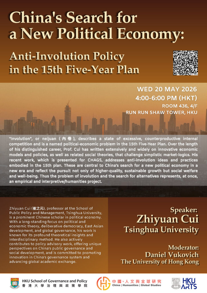 “Involution”, or neijuan (內卷), describes a state of excessive, counterproductive internal competition and is a named political-economic problem in the 15th Five-Year Plan. Over the length of his distinguished career, Prof. Cui has written extensively and widely on innovative economic models and policies, as well as related social theories, that challenge simplistic market-logics. His recent work, which is presented for CHAGS, addresses anti-involution ideas and practices embodied in the 15th plan. These are central to China’s search for a new political economy in a new era and reflect the pursuit not only of higher-quality, sustainable growth but social welfare and well-being. Thus the problem of involution and the search for alternatives represents, at once, an empirical and interpretive/humanities project.